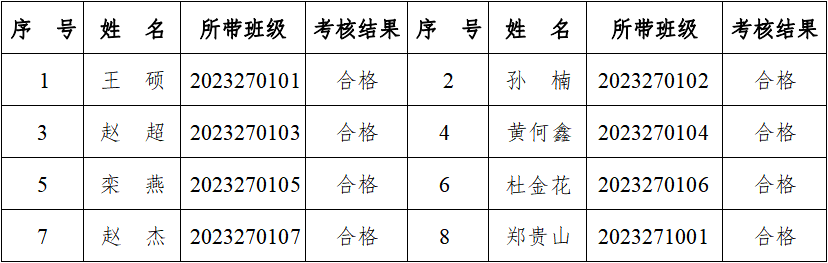 根据学校《关于开展本科生班主任考核及聘任工作的通知》,经个人申报、提交工作手册和工作总结及个人述职等环节,结合学生代表座谈会意见及学生无记名评价结果,拟评定王硕等8名教师班主任工作考核合格;经个人申报、领导小组评议,拟聘任胡波等16名教师为麻豆网