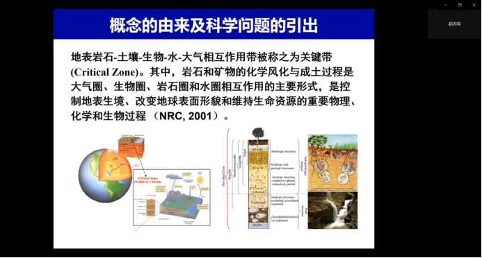 报告伊始,赵志琦老师鼓励老师同学们要正确面对疫情,坚持认真工作、学习,相信一定能够迎来胜利。赵老师向参会师生系统阐述地球关键带的概念、由来、影响关键带形成和演化的因素以及与关键带相关的核心科学问题,并表示关键带的研究涉及多学科的交叉与融合,关键带科学研究具有重要的科学意义;随后赵老师就“地球关键带国际研究动态”、“我国为什么要对关键带进行研究”和“我国关键带的研究现状”等三个方面进行重点展开,详细介绍我国三个关键带观测站。最后鼓励研究生将自己的发展融入国家发展之中,为国家发展服务。