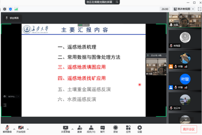 刘磊教授从遥感地质机理出发,详细讲述地质中常见光谱吸收特征,介绍遥感地质常用数据的特点与图像处理方法;随后通过新疆昌吉与甘肃北山的研究实例,向参会师生讲述遥感地质填图的应用;重点选择粘土型锂矿、镁铁-超镁铁质岩型铜镍矿、斑岩型铜金矿、沉积岩有关的铅锌矿、石英脉有关矿化和玉石矿等不同研究实例,展示遥感地质找矿的应用成果;最后刘老师分别阐述土壤重金属遥感反演和水质参数遥感反演的反演机理,并展示课题组在近年来取得的成果。