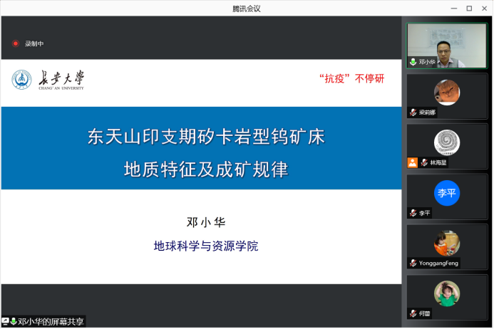 “长安学者”的邓小华教授和徐海教授做学术报告,邓小华教授报告题目为“东天山印支期矽卡岩型钨矿床地质特征及成矿规律”,徐海教授报告题目为“亚洲内陆干旱区全新世可能的水文气候模态及机制”,我院师生共计190人参加本次线上学术报告,报告由院长李荣西教授主持。