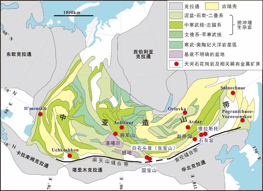 团队通过对全球天河石花岗岩及相关稀有金属矿床相关资料的系统收集与整理,发现中亚造山带产出了全球过半的天河石花岗岩,是最全球最重要的天河石花岗岩和相关稀有金属矿床成矿带;通过对带内岩浆活动、构造演化与成矿作用的综合研究,厘定了中亚造山带晚古生代以来的岩浆-热液矿床的时-空格架,构建了天山造山带成矿综合模型;通过对国宝山和张宝山两个超大型铷矿床不同岩相中锆石、独居石、锡石和铌钽矿等副矿物的U-Pb 年龄和微量元素组成分析,将Rb矿化有关的岩浆-热液演化过程限定于早-中三叠世 (240 ~ 249 Ma),成矿作用持续时间达十个百万年;并通过对同期花岗质侵入体及暗色包体的年代学、地球化学和矿物学研究,揭示出中亚造山带西段印支期岩浆活动是板内伸展导致的软流圈地幔上涌和壳幔相互作用的产物。