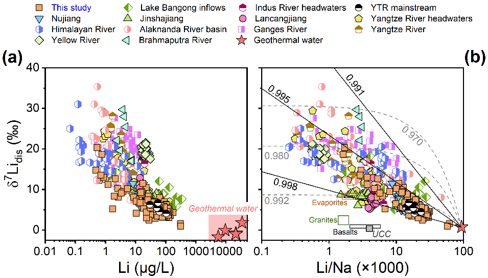 大陆硅酸盐风化通过消耗大气 CO2 影响着长时间尺度的全球气候变化,如何示踪大陆硅酸盐风化一直是学者们关注的重要科学问题。Li及其同位素具有示踪硅酸盐风化的潜力,其原因之一是Li主要赋存于硅酸盐矿物中,因此,通常认为河水中Li主要源自硅酸盐风化。然而,青藏高原地区广泛分布的热泉中Li含量异常高(ppm),热液活动是否会改变河水Li含量及其同位素组成?影响程度如何?对利用河水Li同位素组成示踪流域硅酸盐风化过程有无影响?