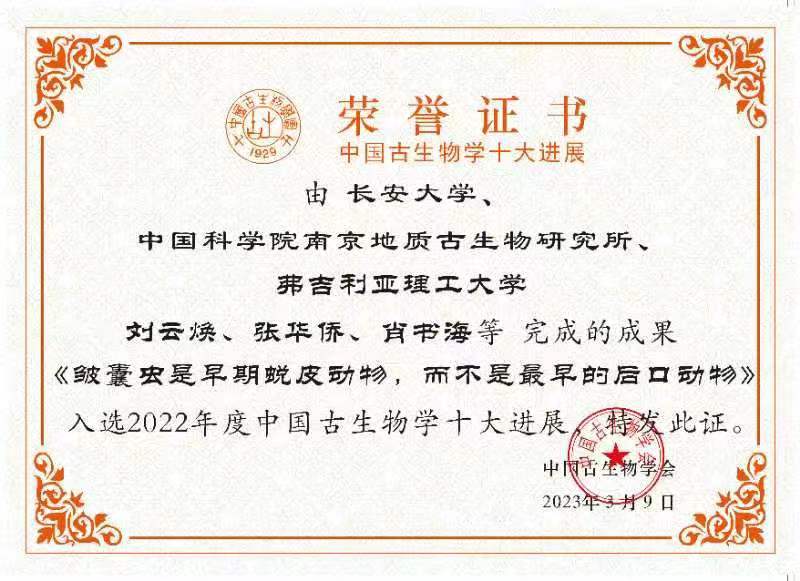 、中国科学院南京地质古生物研究所、弗吉利亚理工大学(美国)、布里斯托尔大学(英国)、山东科技大学;主要完成人:刘云焕、张华侨、肖书海、Philip C. J. Donoghue、Michael Steiner。