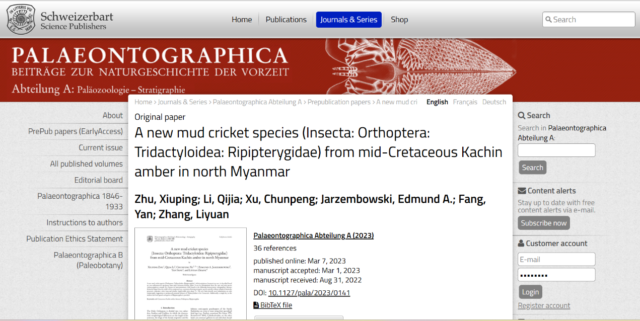 近日,我院2019级地质学专业本科生朱修萍同学在全成教授、李琪佳博士和南京地质古生物研究所王博研究员、许春鹏博士等人的共同指导下,以第一作者在国际经典古生物期刊Palaeontographica Abteilung A(JCR二区)上发表了题为A new mud cricket species (Insecta: Orthoptera: Tridactyloidea: Ripipterygidae) from mid-Cretaceous Kachin amber in north Myanmar的研究论文。