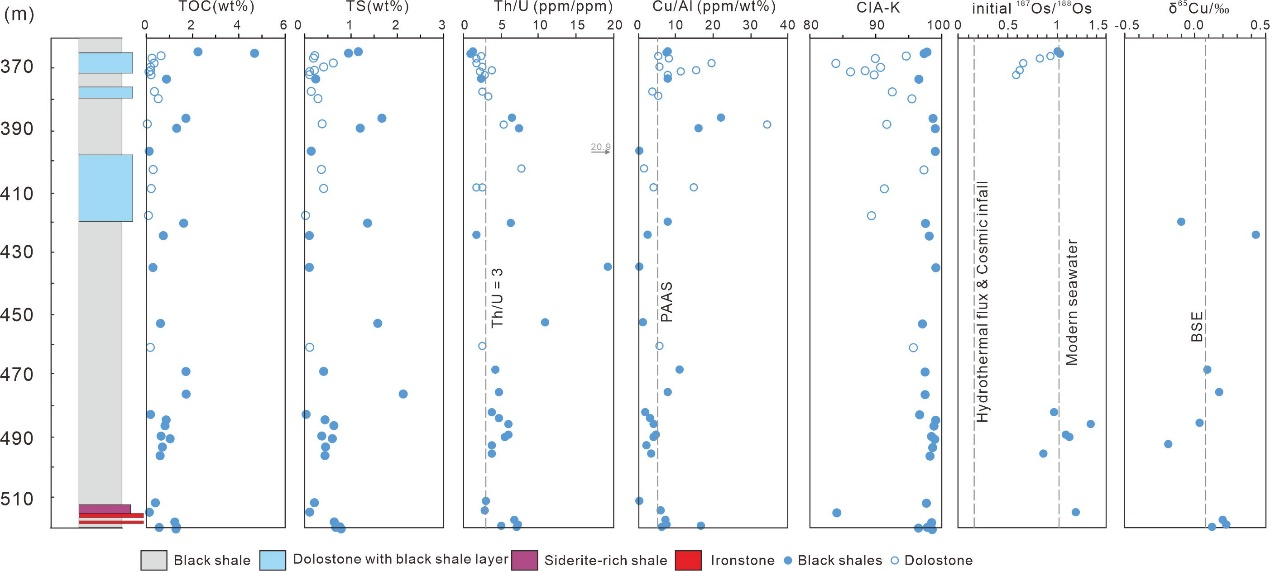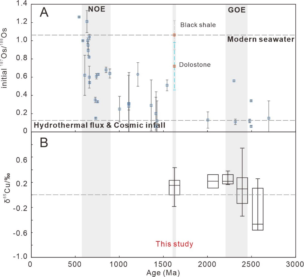 铼-锇(187Re-187Os)体系不仅是一种用途广泛的精密计时器,还可以有效地示踪沉积古环境。在氧化的大气圈,Re以ReO4-形式被搬运进入海洋,187Re通过β-衰变逐渐转变为稳定同位素187Os,这一衰变过程具有稳定的半衰期(约41.6×1010年)。海水187Os/188Os组成反应了放射成因Os和非放射成因Os输入状态,例如现代海洋187Os/188Os比值约为1.06,这是由于陆表径流带来了大量氧化风化来源的放射成因Os。而来自宇宙尘埃和海底热液Os同位素具有非放射成因特征,187Os/188Os约为0.13。因此,海水187Os/188Os可以示踪地球表层氧化还原环境演化。近年来,铜同位素也用于研究地球表生环境演化过程,例如前人研究表明,氧化风化大陆硫化物(例如黄铜矿和辉铜矿)将会通过陆表径流向海洋输送重铜(65Cu)同位素。我国华北克拉通16.4亿年串岭沟组发育有地球平静期最古老、保存最好的黑色页岩。鉴于此,我院杨秀清教授、中国地质科学院矿产资源研究所毛景文院士及其国内外合作者对我国华北克拉通串岭沟组中黑色页岩和白云岩开展了元素、Re-Os和Cu同位素组成研究,取得了如下重要认识: