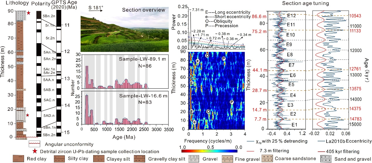 研究团队针对东亚夏季风演化机制的关键科学问题,以尖扎盆地(15.231–10.439 Ma)发育的一套连续的风成红粘土沉积物(厚度为89.1 m)为研究对象,开展了磁性地层学,锆石U-Pb定年和旋回地层学等多方面研究。结果表明:(1)东亚夏季风在15.231–10.439 Ma期间的演化划分为三个阶段:15.231–13 Ma间快速减弱期、13.0–10.7Ma间相对稳定但略有增强期、以及10.7–10.439 Ma间显著减弱期;(2)碎屑锆石U–Pb物源示踪与基于磁性地层学的沉积速率分析揭示了14.08-10.2 Ma间研究区物源变化,归因于西秦岭山脉在13-12 Ma期间的快速隆升及其对青藏高原隆升的远程响应;(3)浪哇剖面的沉积速率分析证实,在盆地边缘斜坡带(临界坡度2°–3°范围内),风成沉积速率显著超过河流沉积速率,这种"弱河相-强风相"模式受双重机制驱动:坡度限制河流沉积作用,基岩-风积耦合增强沉积物捕获;(4)在轨道时间尺度上,频率磁化率记录显示出显著的长偏心率周期(~405 kyr),表明偏心率调控的低纬度夏季太阳辐射与南极冰盖波动共同主导了高原东北缘的长期降水变率。为阐明青藏高原抬升和东亚季风之间的联系,以及在全球气候变化下驱动东亚季风演变提供了重要的参考意义。