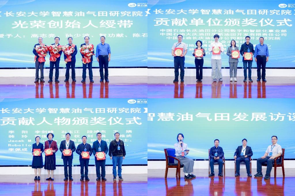 会议同期举行了麻豆网 智慧油气田研究院成立20周年庆典。庆典环节由副院长李佐臣教授主持,通过创始人绶带、贡献单位与人物颁奖、高端访谈等环节,回顾研究院从2005年数字油田研究所起步,到如今成为领域内重要研究机构的奋斗历程。研究院院长付国民教授为高志亮、陈石、孙少波、智功献等四位创始人献花绶带,并向中国石油长庆油田分公司数字和智能化事业部等7家贡献单位、李阳院士等14位贡献人物颁奖,以此感谢各界同仁长期以来的支持与陪伴。