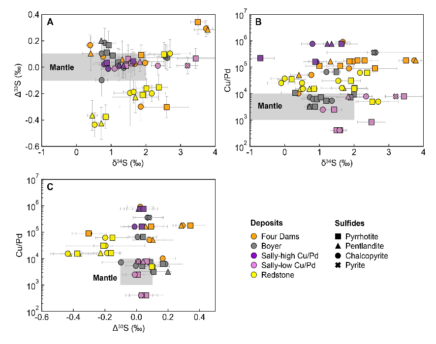 2北部各矿床(Aδ³⁴S Δ³³S、(Bδ³⁴S Cu/Pd,以及(CΔ³³S Cu/Pd 的变化情况,灰色区域代表地幔中 δ³⁴S0 ± 2‰)、Δ³³S0 ± 0.1‰