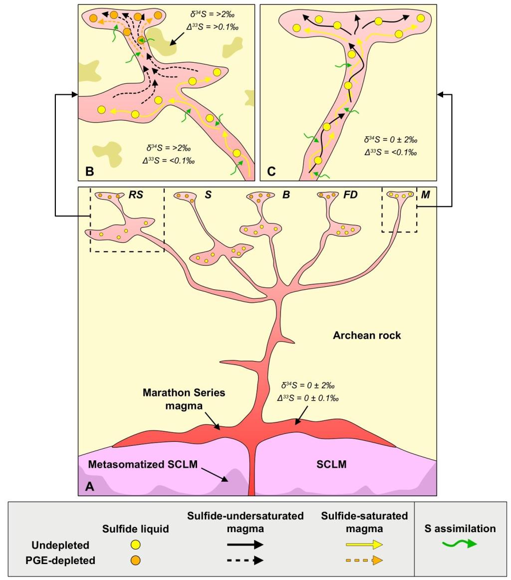 3AMaraton矿床与北部各矿床之间的成因关系,以及可能导致(BNorthern矿床和(CMaraton矿床形成独特的Cu /Pd比值和S同位素组成的过程。缩写说明:B = BoyerFD = Four DamsM = MaratonRS = RedstoneS = Sally