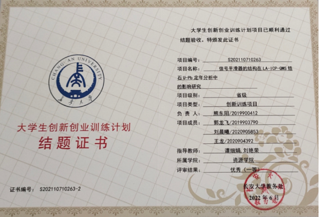 在谭细娟老师和刘艳荣老师的指导下,依托省级大学生创新训练项目,熊东阳等同学从ICP-QMS核心部件等离子体矩管得到启发,以玻璃为制作材料,设计制作了不同体积(14.1~125 mL)和不同形状(圆柱形、球形和方形)的信号平滑器,探究了信号平滑器的体积和形状与LA-ICP-QMS实时信号波动性的相互关系,明确了体积为21.2 mL的圆柱形信号平滑器的分析性能与商业化的“squid”信号平滑器相当,并成功将该信号平滑器应用于锆石U-Pb定年分析。