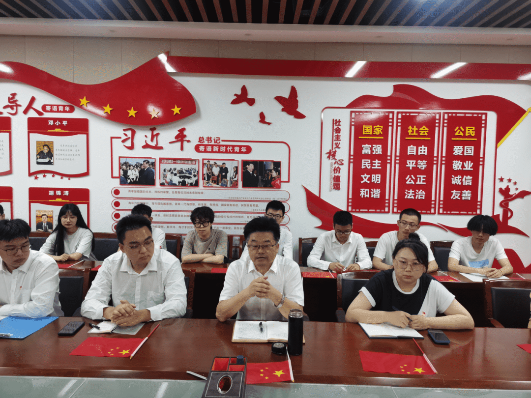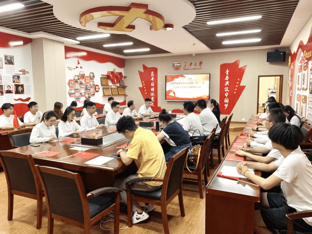 为庆祝中国共产党成立102周年和深入开展学习贯彻习近平新时代中国特色社会主义思想主题教育,激励党员旗帜鲜明听党话,坚定不移跟党走,2023年6月30日11时,我院本科生党支部在北校区长安文化艺术中心党建活动室举办庆“七一”暨新发展党员入党宣誓活动,学院党委书记黄喜峰、党委副书记武永江、支部组织委员黎皛,2022级辅导员樊惠彬、孙梦瑶,支部全体学生党员和入党积极分子代表参加。活动由党支部书记巩昌盛主持。