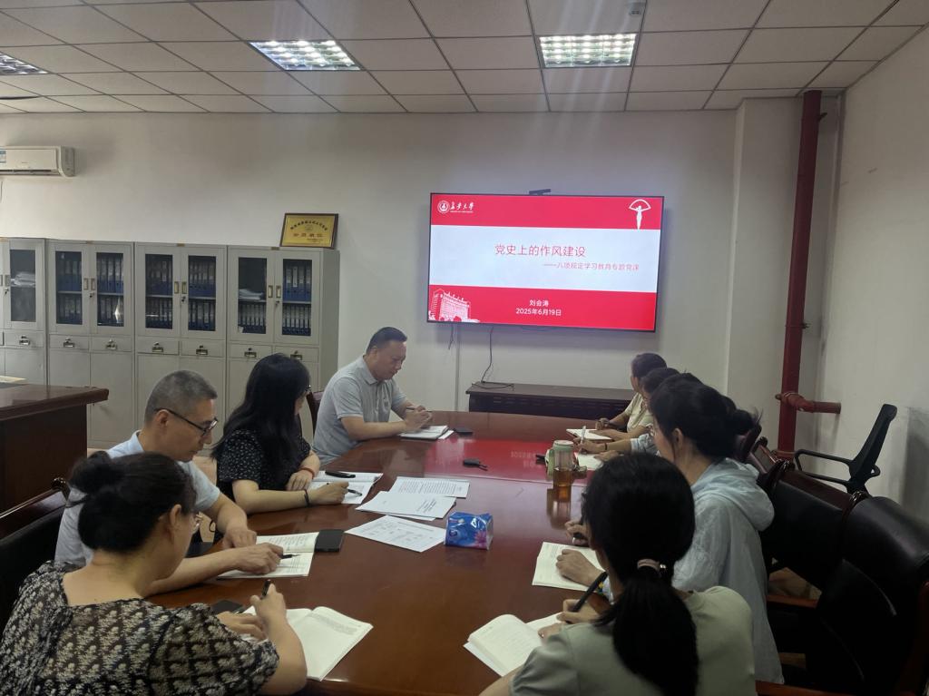 为深入贯彻中央八项规定精神学习教育成效经验,深入推进作风建设,强化党员干部责任担当,2025年6月19日,学党委副书记刘会涛以《党史上的作风建设》为题为机关实验党支部党员讲授专题党课。